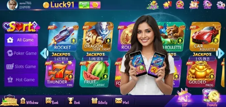 Luck91 game is a complete mobile gaming app that lets players enjoy multiple games while earning coins. It features popular games like slots, teen patti online, poker, blackjack, roulette, crash games, and video poker.